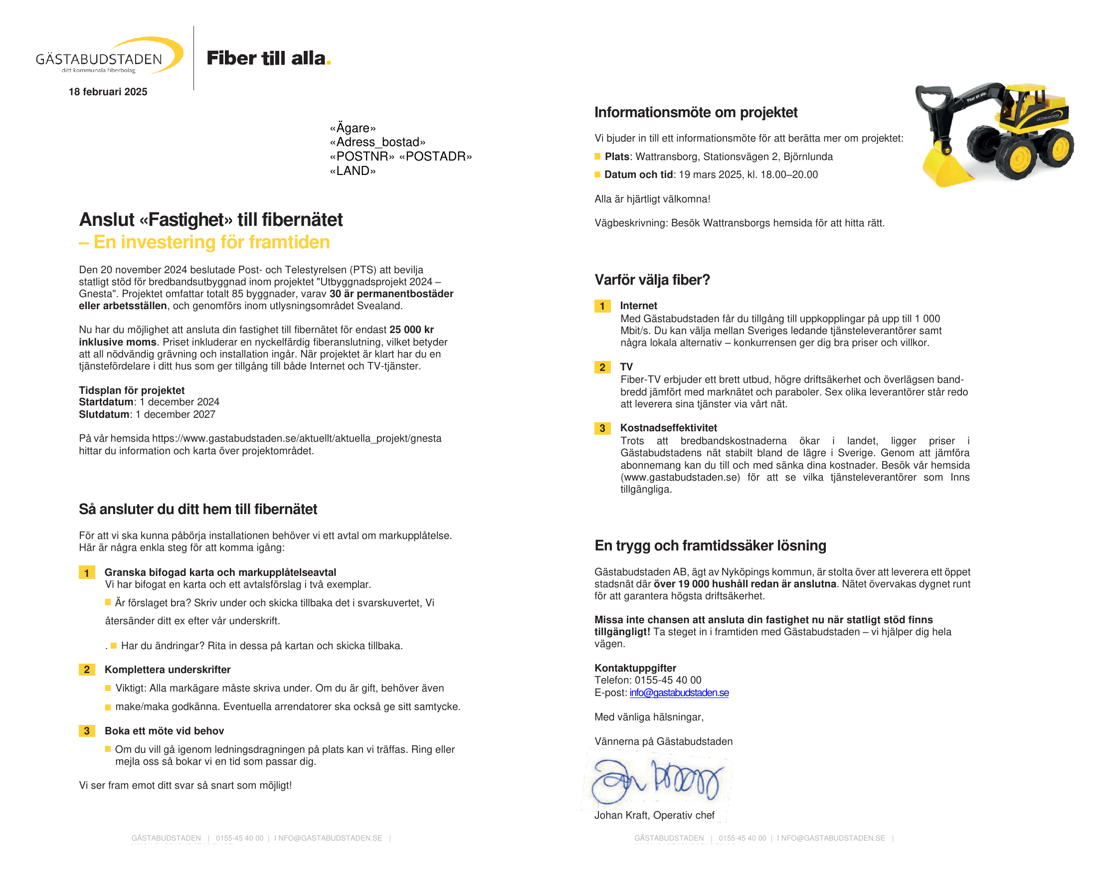Fastighetsägare inom projektområdet kommer att få en personlig inbjudan tillsammans med erbjudandet om fiberanslutning. Vi planerar att skicka ut erbjudandet i samband med månadsskiftet januari/februari.