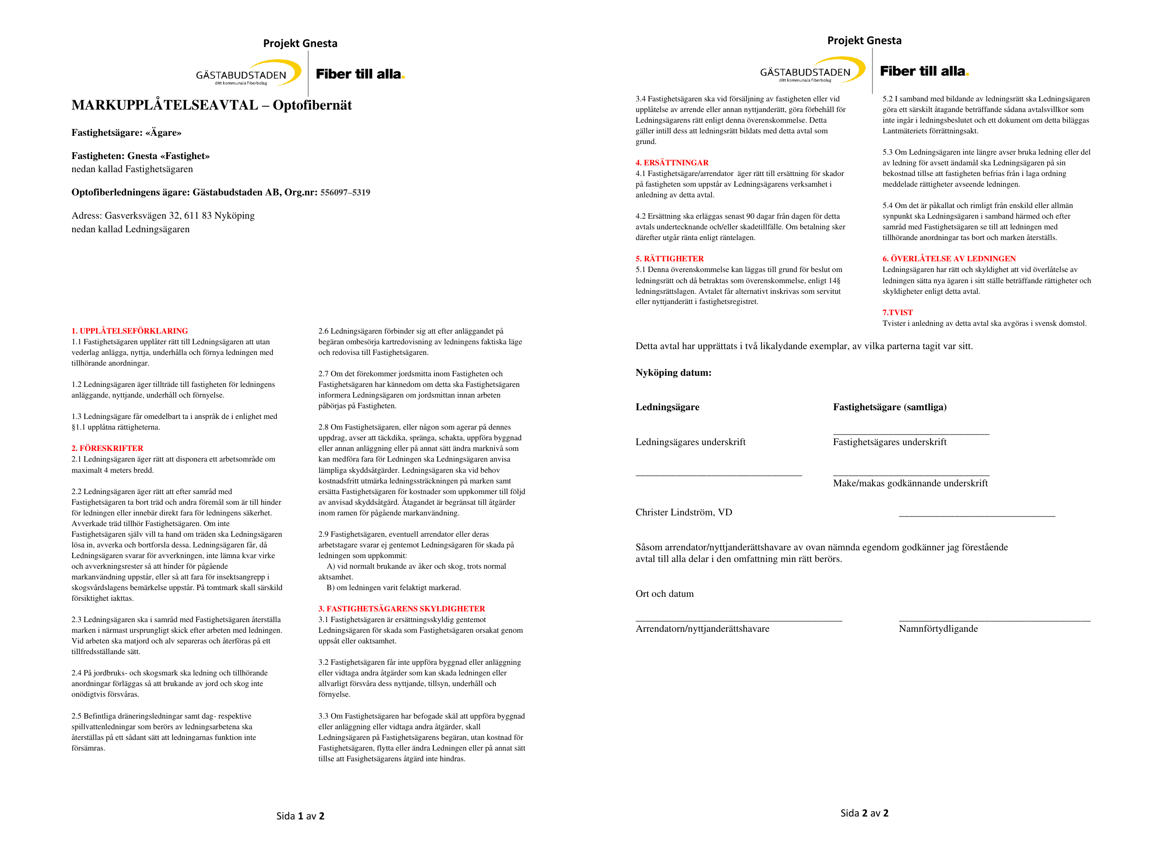 För att beställa en fiberanslutning behöver fastighetsägaren även teckna ett markupplåtelseavtal med Gästabudstaden. Avtalet hittar du nedan.